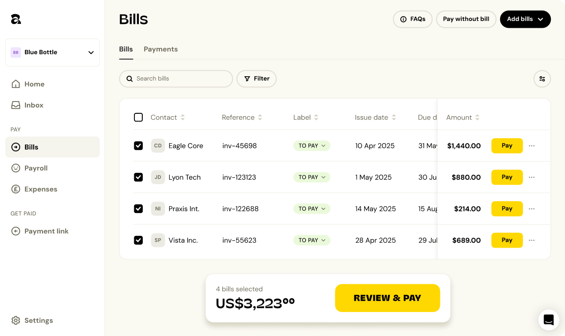 Drop a bill into Apron, sync it from Xero or QuickBooks, or enter the info manually.